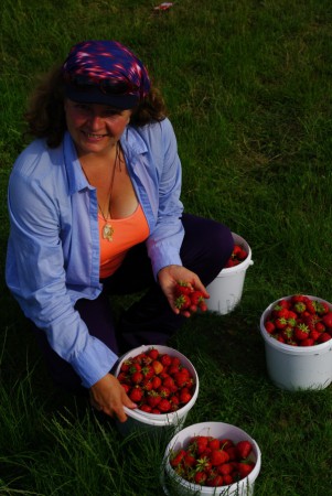 Jarní fotka našeho sadu...žluté pampelišky všude, v popředí jezírko, na obzoru hrad Pecka